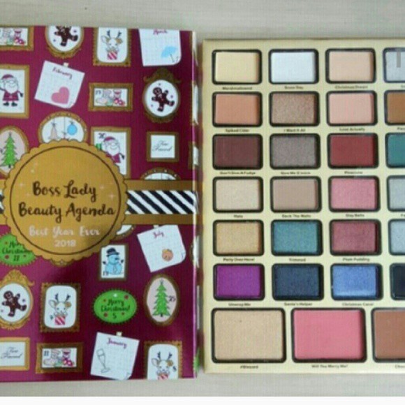 Too Faced | Makeup | Too Faced Best Year Ever 28 Boss Lady Holiday ... Shop Women's Too Faced Brown Pink Size OS Eyeshadow at a discounted price at Poshmark. Description: Too Faced Best Year Ever 2018 Boss Lady Holiday Eyeshadow & Face Palette - swatched only a couple shades & sanitized. This limited edition palette includes everything you need for a full face of glam makeup! This set contains: - 24 x 0.03 oz/ 0.95g Eyeshadows in Christmas Carol, Party Over Here ...