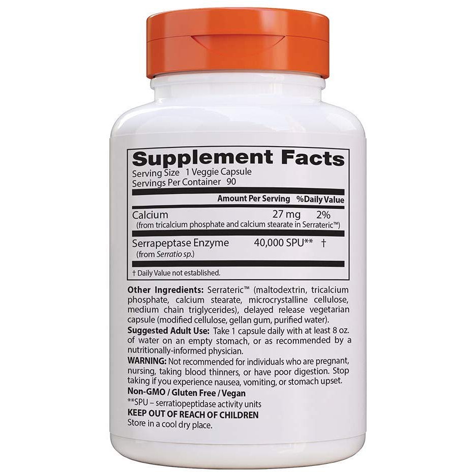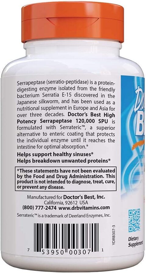 Doctor's Best High Potency Serrapeptase, 120,000 SPU, 90 Veggie Caps Doctor's Best High Potency Serrapeptase, 120,000 SPU, 90 Veggie Caps $39.99 Helps support healthy sinuses* Helps breakdown unwanted proteins* Add to cart Free Shipping on orders above $20 Product Overview Description Science-Based Nutrition™ Helps Support Healthy Sinuses Helps Breakdown Unwanted Proteins Dietary Supplement
