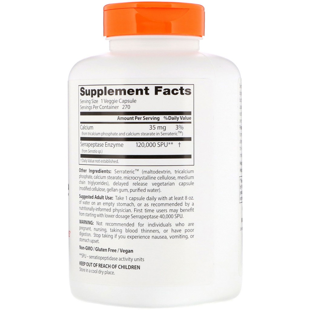 Doctor's Best Serrapeptase, 270 Veggie Caps Doctor's Best Serrapeptase, 270 Veggie Caps $45.99 Helps support healthy sinuses* Helps breakdown unwanted proteins* Add to cart Free Shipping on orders above $20 Product Overview Description Science-Based Nutrition™ Helps Support Healthy Sinuses Helps Breakdown Unwanted Proteins Dietary Supplement Vegan™ Non-GMO / Gluten-Free / Vegan